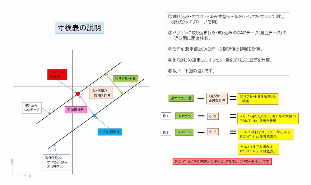 今まではCADで測定箇所を指示して現場で測定して誤差を算出していましたが、このシステムは現場で任意点を測定するとCADデータとの面直方向で測定誤差を自動算出する仕組みとなっています